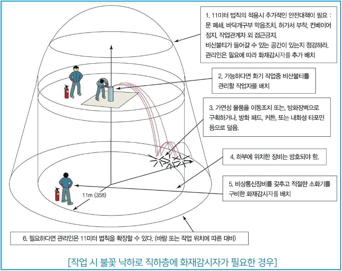 1) 화재안전 감독자(감독관)는 예상되는 화기작업의 위치를 확정하고, 화기작업의 시작 전, 작업현장의 화재안전조치 상태 및 예방책을 확인한다.