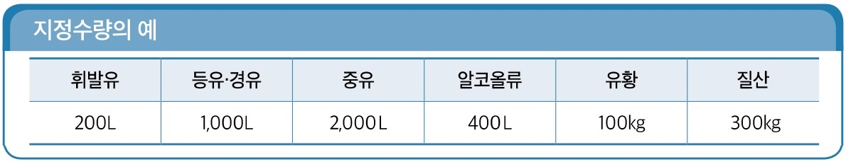 2) 지정수량 : 위험물의 종류별로 위험성을 고려하여 대통령령이 정하는 수량으로서 제조소등의 설치허가 등에 있어서 최저의 기준이 되는 수량