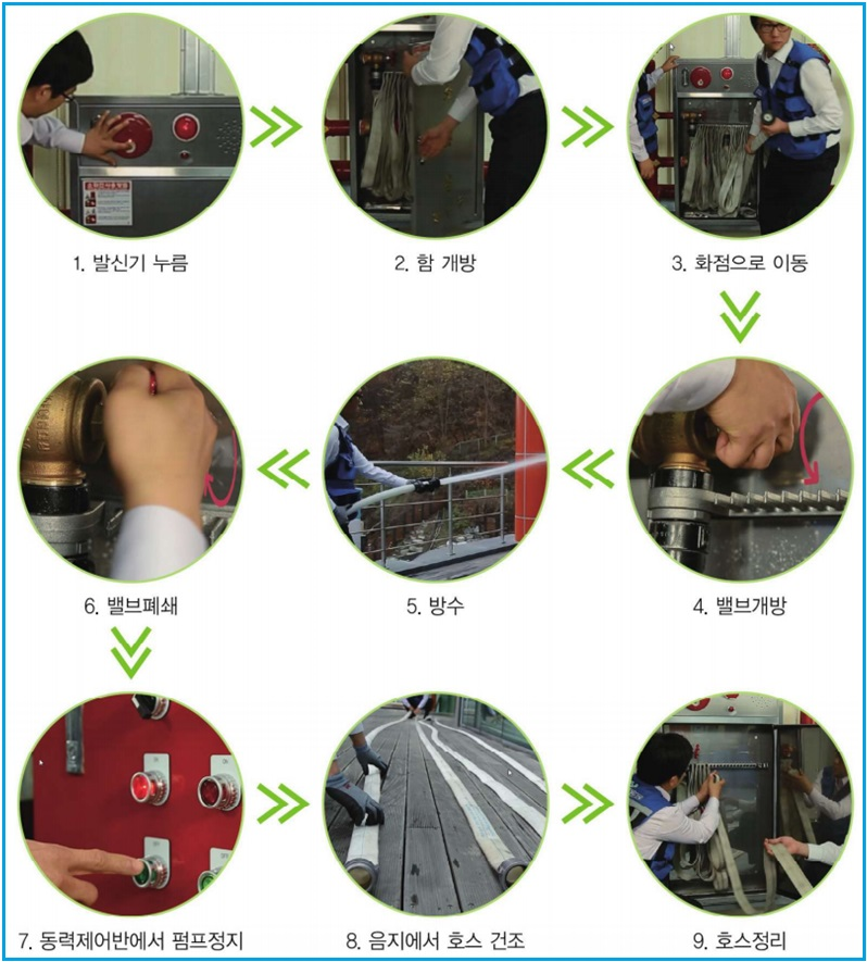 ⑴ 옥내소화전설비의 성능 : 옥내소화전(2개 이상인 경우 2개, 고층건축물의 경우 최대 5개)을 동시에 방수할 경우 각 소화전 노즐에서 법적 방수량 및 방수압력