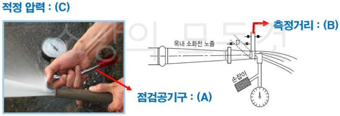 ⑵ 따라서, 점검공기구(A)는 피토게이지, 방수압력 측정거리(B)는 노즐구경의 ½, 적정 압력(C)은 0.17~0.7MPa이 된다.