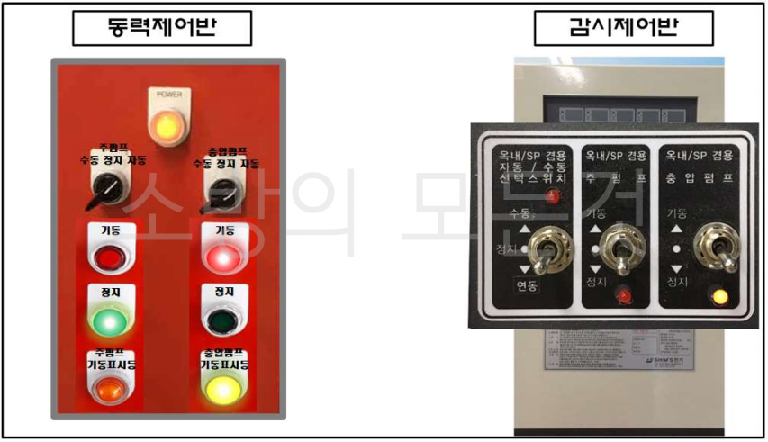 13. 옥내소화전설비의 동력제어반과 감시제어반을 나타낸 것이다. 옳지 않은 것은?