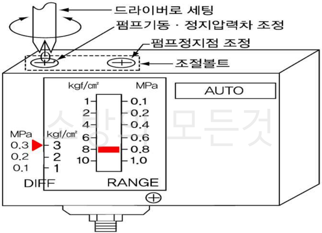 ⑴ 그림상에서 펌프의 정지점(RANGE)은 0.8MPa이고 DIFF점이 0.3MPa이다.