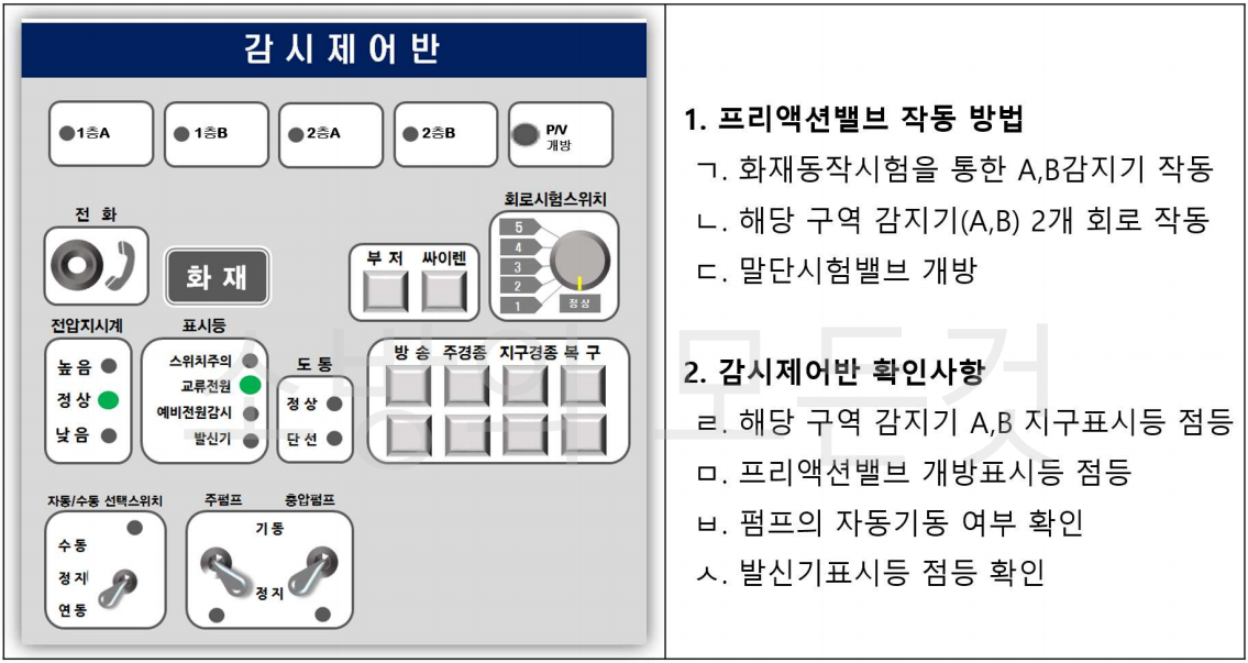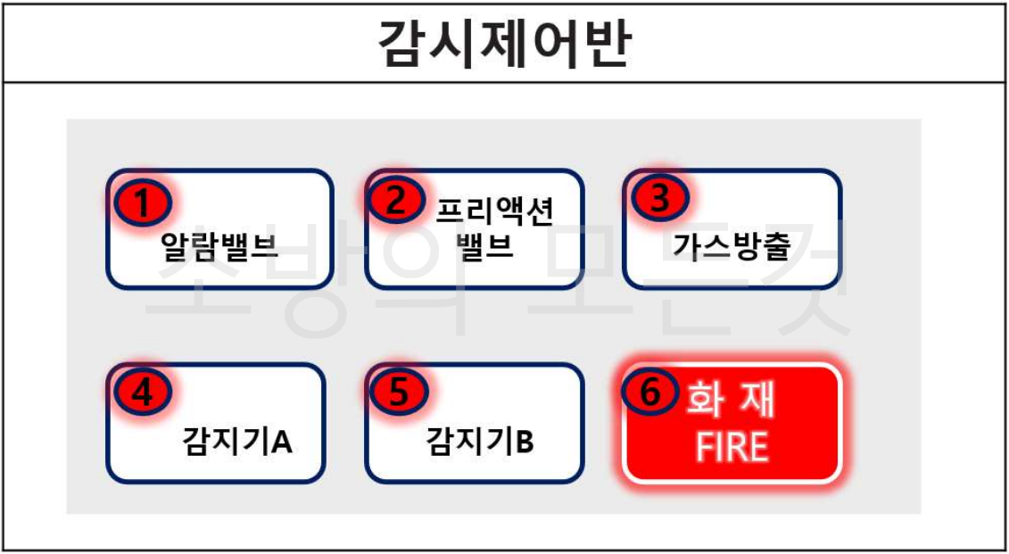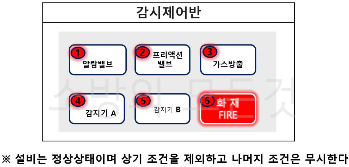 ⑷ 감시제어반(수신반) 화재표시등 점등 확인, 해당구역 밸브개방 표시등 점등 확인, 해당 방호구역의 음향장치(사이렌) 작동 확인