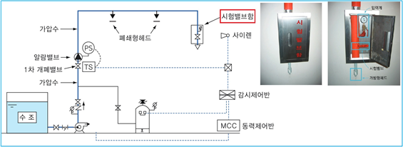 ⑵ 가압수 배출을 위한 시험밸브(그림에서 하단 밸브)는 평상 시에 폐쇄상태로 관리하고 개방 시험 시에만 개방하여 감시제어반(수신반)에서 화재표시등 점등 확인, 해당 구역 밸브개방 표시등 점등 확인, 해당 방호구역의 음향장치