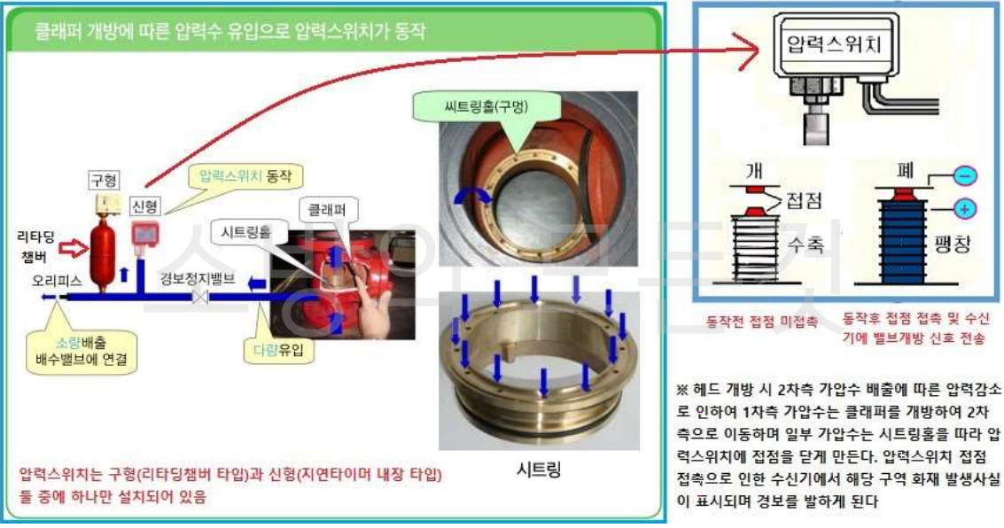 ⑶ 클래퍼의 개방으로 시트링홀에 물이 들어가 압력스위치의 접점 접촉으로 감시제어반(수신반)에 신호 송출