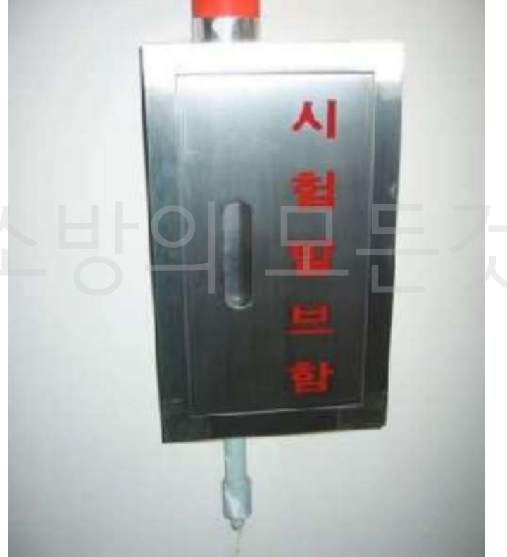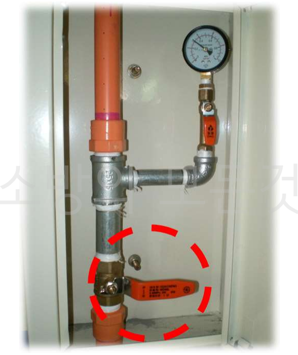 ⑶ 따라서, 압력계 밑에 부착된 개폐밸브는 평상 시에 개방하여 시험밸브 배관 내의 압력이 정상압력(0.1MPa 이상 1.2MPa 이하) 인지 여부를 확인해주어야 하며 가압수 배출을 위한 시험밸브는 평상 시에 폐쇄 상태로 유지관리 되어야 한다.