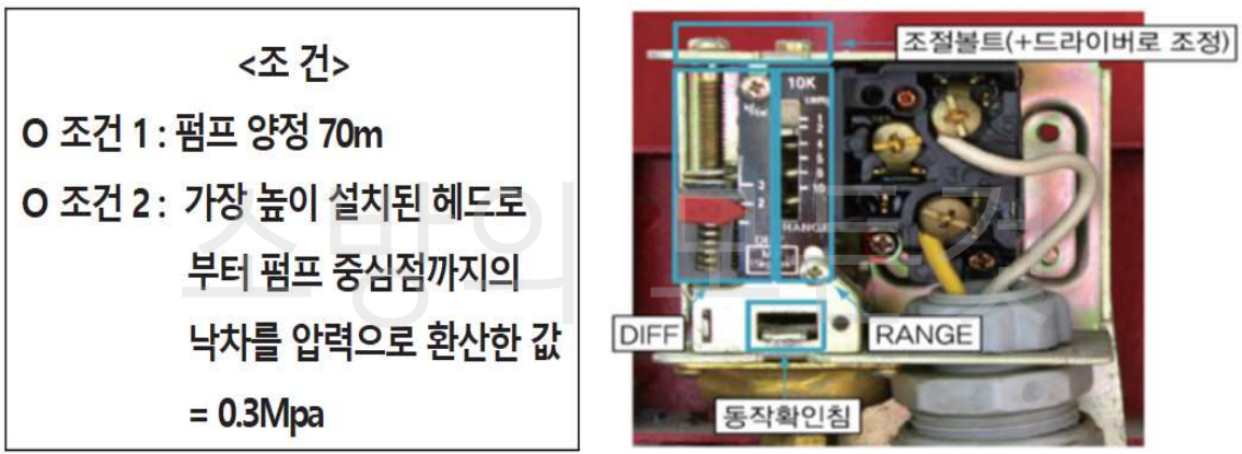 ※ 대부분의 현장에서 충압펌프와 주펌프는 동일한 전양정의 펌프를 사용하므로 주펌프의 양정값이 충압펌프의 양정값으로 생각해도 된다. 또한 충압펌프 정지점과 주펌프 정지점을 같게 하여도 주펌프에만 자기유지회로를 설치하여 충압펌프는 정지점에서 자동 정지가 되지만 주펌프의 경우에는 한번 기동되면 배관 내(압력챔버 내)의 압력이 정지점(양정값)에 도달하더라도 자동으로 정지되지 않고 계속해서 기동이 유지되므로 수동정지 기준(2006년 12월 30일 이후 건축허가동의대상물)에 적합하게 된다.