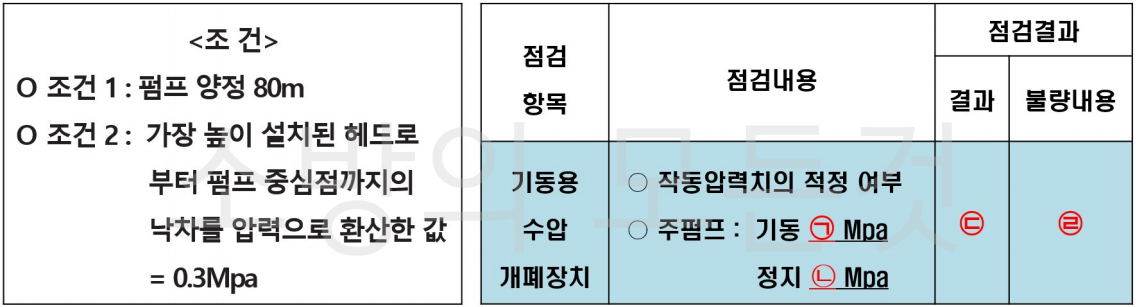 ⑶ 따라서, 주펌프 기동점(㉠)은 “0.45MPa”, 주펌프 정지점(㉡)은 “0.8MPa”, 점검결과(㉢)는 “O”, 점검결과 불량내용(㉣)은 “없음” 이다.