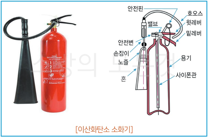 ⚬ 이산화탄소 소화기(BC급 소화기) : 본체 용기에 충전된 이산화탄소를 레버식 밸브의 개폐에 의해 방사(지시압력계 없음, 내용연수 규정 없음)