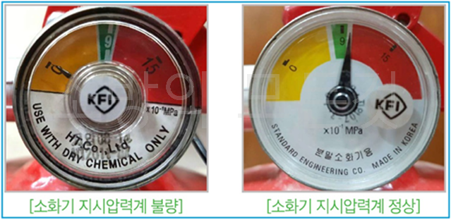 ⚬ 소화기의 점검(지시압력계) : 지시압력계가 녹색범위(0.7MPa~0.98MPa)에 있어야 정상이며, 녹색 범위의 좌측을 가리키면 압력이 부족한 것으로 재충전 또는 소화기 교체가 필요하다. 녹색 범위의 우측(적색)을 가리키면 과압(압력이 높음) 상태를 나타낸다.