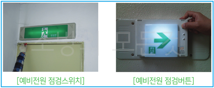 3) 예비전원(배터리) 점검 : 예비전원 상태의 점검은 외부에 있는 점검스위치(배터리상태 점검스위치)를 당겨보는 방법 또는 점검버튼을 눌러서 점등상태를 확인한다.