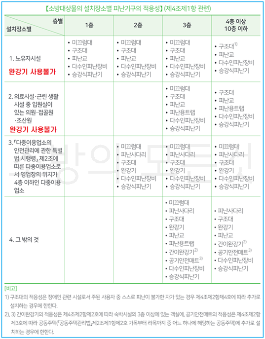 ⚬ 소방대상물의 설치장소별 피난기구의 적응성