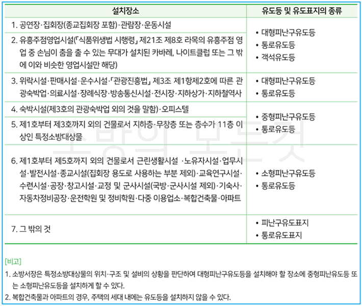 2) 설치장소별 유도등 및 유도표지의 종류