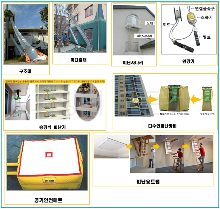 ⚬ 피난기구의 종류(피난기구는 법적으로 지상 10층 까지만 설치해도 된다.)