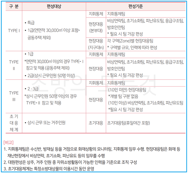 ⚬ 자위소방대 조직 편성기준 : 대상처의 규모, 소방시설 및 편성대원을 고려하여 조직(Type-Ⅰ, Type-Ⅱ, Type-Ⅲ)을 구성한다.