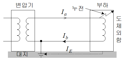 ⑴ 누전이란 전류가 정상적인 전류의 통로 이외의 통로로 흐르는 것을 말한다. 그림에서 누전이 없는 상태에서는 누전전류 IE는 흐르지 않고 Ia = Ib가 된다. 그러나 누전이 되면 Ib = Ia - IE가 되어 Ib는 Ia보다 작아지게 된다.