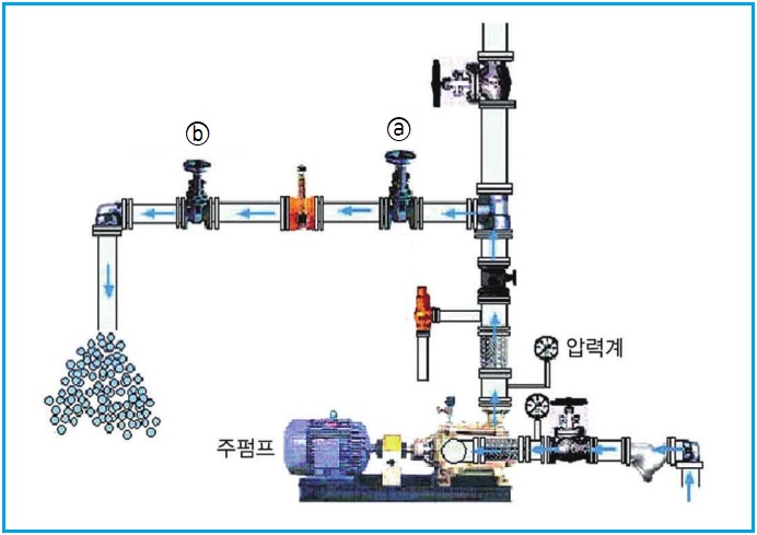⑴ 정격부하운전 : 펌프를 기동한 상태에서 유량조절밸브를 개방하여 유량계의 유량이 정격유량상태일 때, 정격압력 이상이 되는 지를 확인하는 시험이다.