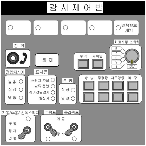 ✔ 2025년 11월 강습교재 개정판 내용으로 문제 반영되어 있음 21. 다음 그림에서 수신기의 점검항목에서 회로별 감지기의 배선의 정상여부를 확인하고자 한다. 수신기의 스위치 중 어느 것을 눌