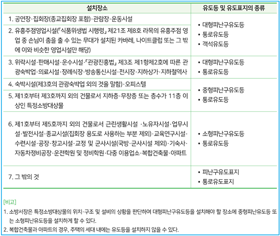 | 구분 | 복도통로유도등 | 거실통로유도등 | 계단통로유도등 |