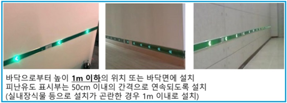 ② 피난유도 표시부는 바닥으로부터 높이 1m 이하의 위치 또는 바닥면에 설치