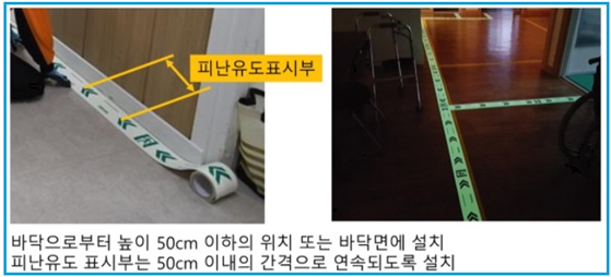 ⑤ 축광방식의 유도표지는 외광 또는 조명장치에 의하여 상시 조명이 제공되거나 비상조명등에 의한 조명이 제공되도록 설치할 것