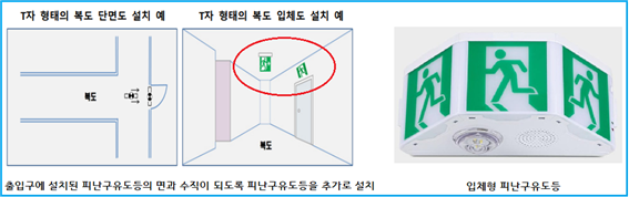 ⑶ 피난층으로 향하는 피난구의 위치를 안내할 수 있도록 ⑴항의 ①호 또는 ⑴항의 ②호의 출입구 인근 천장에 ⑴항의 ①호 또는 ⑴항의 ②호에 따라 설치된 피난구유도등의 면과 수직이 되도록 피난구유도등을 추가로 설치해야 한다. 다만, ⑴항의 ① 또는 ⑴항의 ②호에 따라 설치된 피난구유도등이 입체형인 경우에는 그렇지 않다.