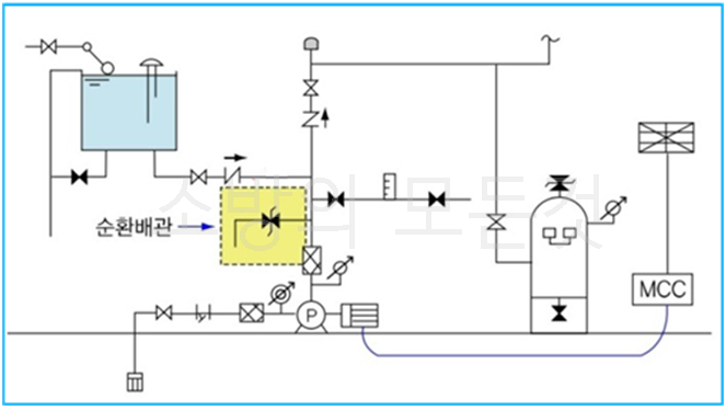 ※ 순환배관 설치 이유 : 체절운전 시 펌프 토출측 배관 내 수온 상승으로 인해 캐비테이션(공동현상) 발생을 초래하게 되어 펌프 임펠러(날개)가 손상될 수 있음. 이를 방지하고자 순환배관 상에 릴리프밸브를 설치하고 과압이 발생하면 수온이 상승하므로 이때 순환배관 상의 릴리프밸브 개방으로 고온수를 배출시켜 캐비테이션(공동현상)을 방지한다.