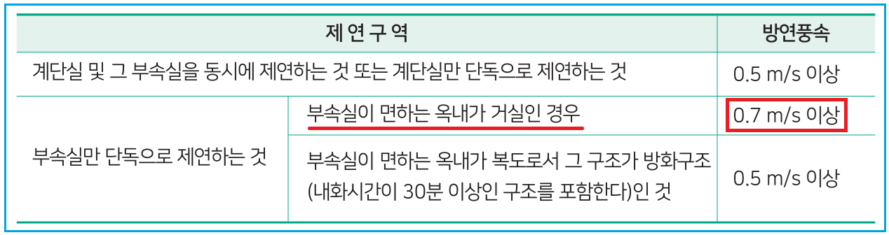 → 방연풍속은 부속실(전실)에서 계단실 및 옥내와 연결되는 문을 모두 개방하고 풍속계로 방연풍속을 측정하며, 문과 마주하는 옥내가 거실(화재실)인 경우에는 0.7㎧ 이상, 그 외에는 0.5㎧ 이상이어야 한다.