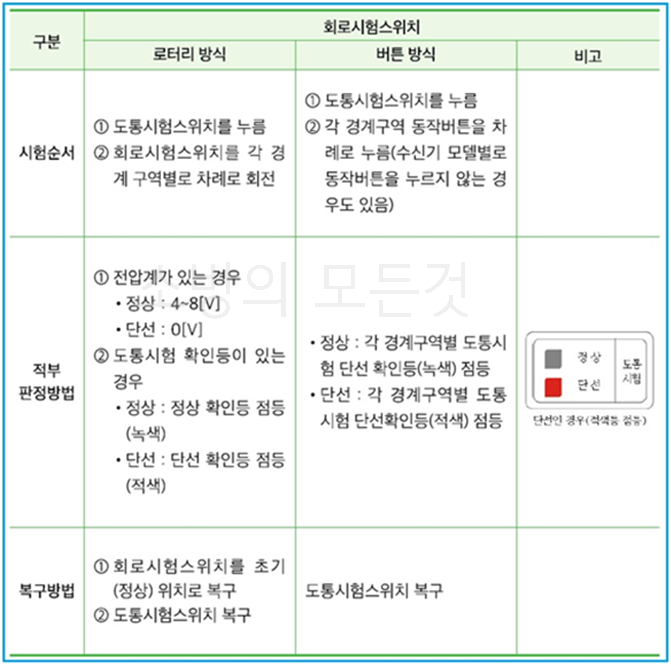 ⑴ 예비전원 시험결과 전압표시등이 녹색이면 정상, 적색(또는 주황색)이면 비정상이다.