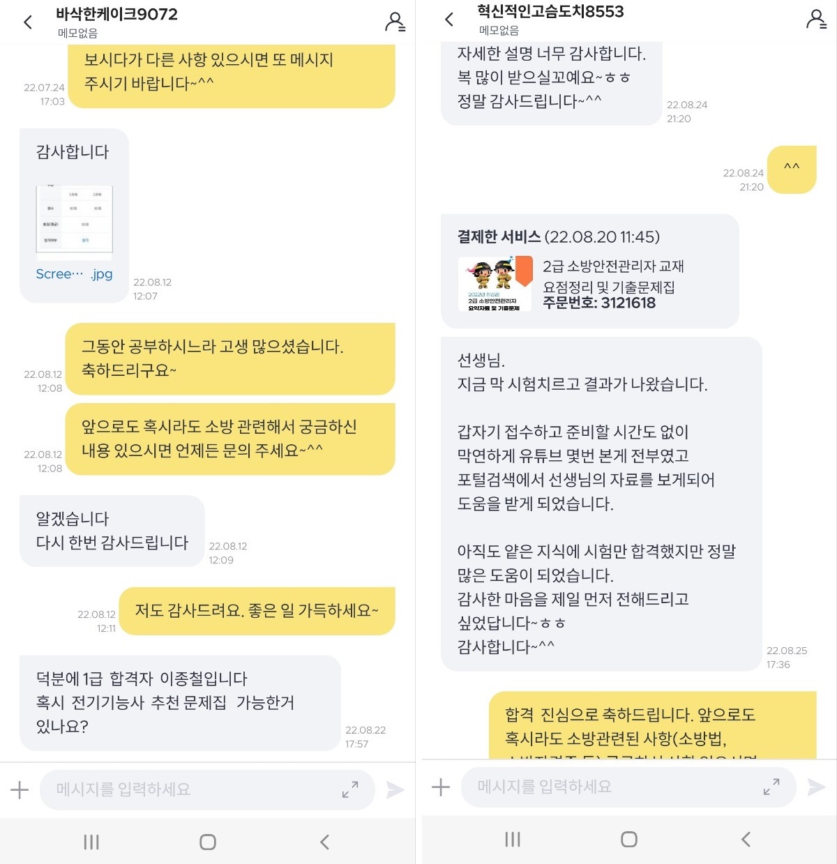 ✔ 참고로 구매자 분들 중에 합격하셨다고 말씀해 주신 분들(1급 보신 분도 있고 2급 보신 분도 있음)과의 대화내용 일부입니다. 교재 요약정리 부분을 같이보면 이해하는데 도움이 되지만 바쁘신 분들은 기출문제만 반복해서 봐줘도(문제마다 해설이 되어 있으므로) 충분히 합격할 수 있습니다.