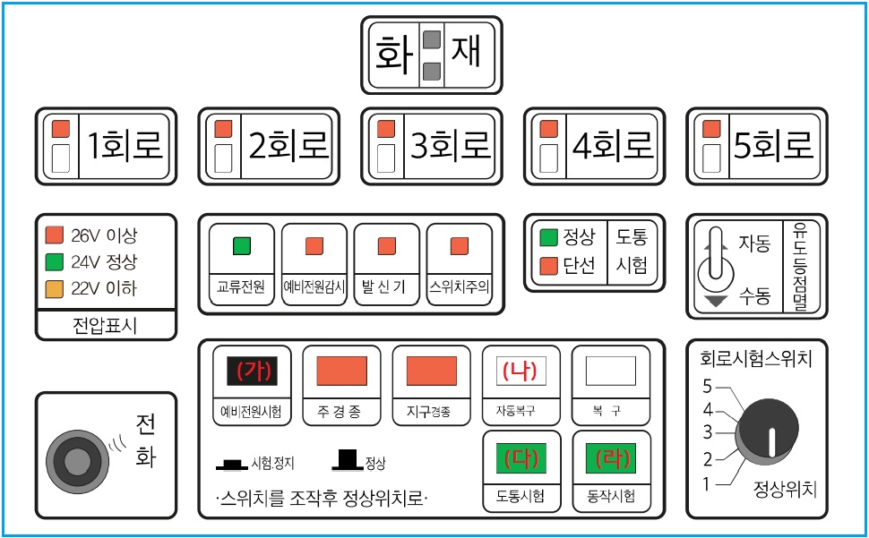 ⑶ 예비전원시험 : 정전 등의 이유로 상용전원(220V)이 차단되는 경우 수신기 내에는 예비전원(24V)으로 자동적으로 절환되는지 여부와 예비전원에 의해서 수신기가 정상적으로 동작할 수 있는지의 여부를 확인하는 시험