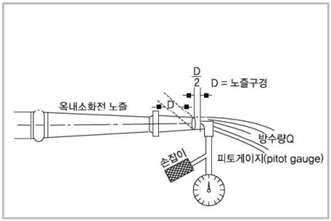 ⑴ 옥내소화전(2개 이상인 경우 2개, 고층건축물의 경우 최대 5개)을 동시에 방수할 경우 각 소화전 노즐에서 법적 방수량 및 방수압력