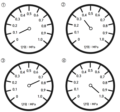 ⑵ 옥내소화전 법정 방수압력은 0.17㎫ 이상 0.7㎫ 이하이므로 보기에서 방수압력측정계(피토게이지) 측정값으로 ②번만 정상 범위에 해당한다.
